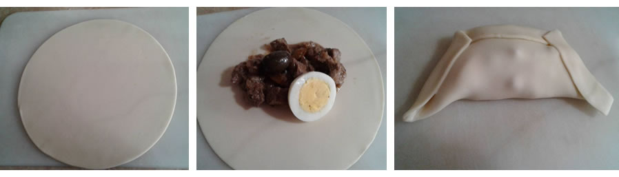 Paso 1: Rellenar con el pino de carne más huevo duro, aceituna y pasas. Mojar las orillas de la masa para cerrar.