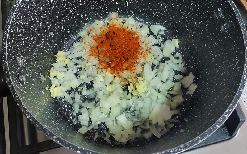 Paso 1: Sofreír cebolla picada, ajo picado y ají de color.