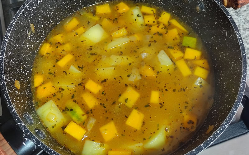 Paso 4: Dejar cocinar hasta que las papas y el zapallo estén blandos.