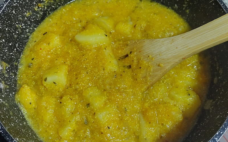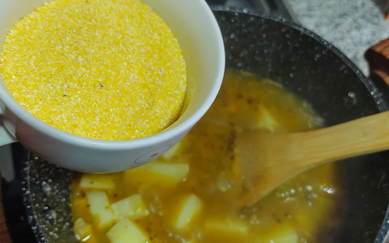 Paso 5: Una vez cocida la papa y el zapallo agregar la chuchoca o polenta, puedes ocupar media taza. En este caso es poca cantidad ya que es para dos a tres personas. Agregar en forma de lluvia la chuchoca o polenta.
